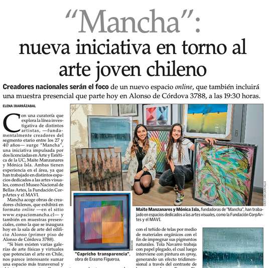 Mancha es una plataforma que busca visibilizar el trabajo de artistas nacionales y promover la circulación de los mismos a través de la venta de sus obras, asesorías y facilidades de venta.