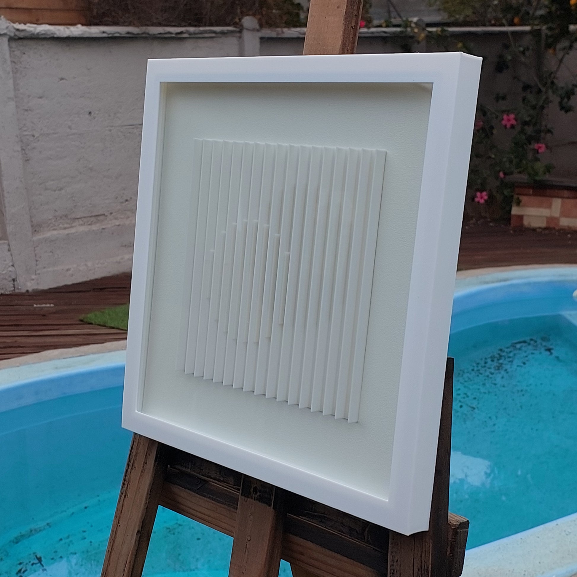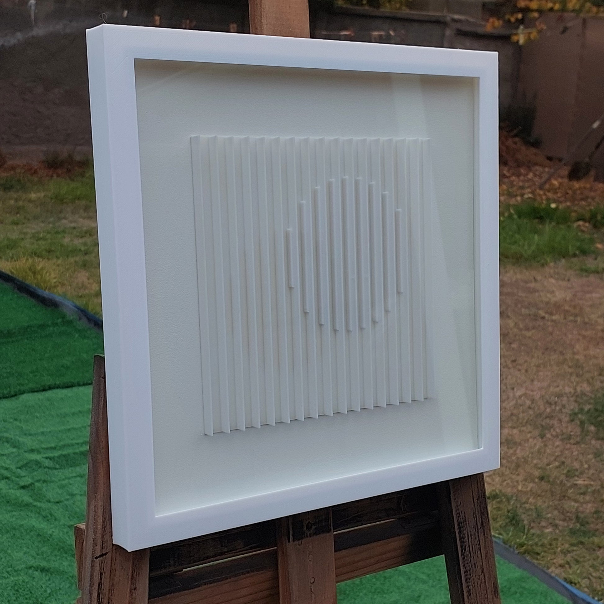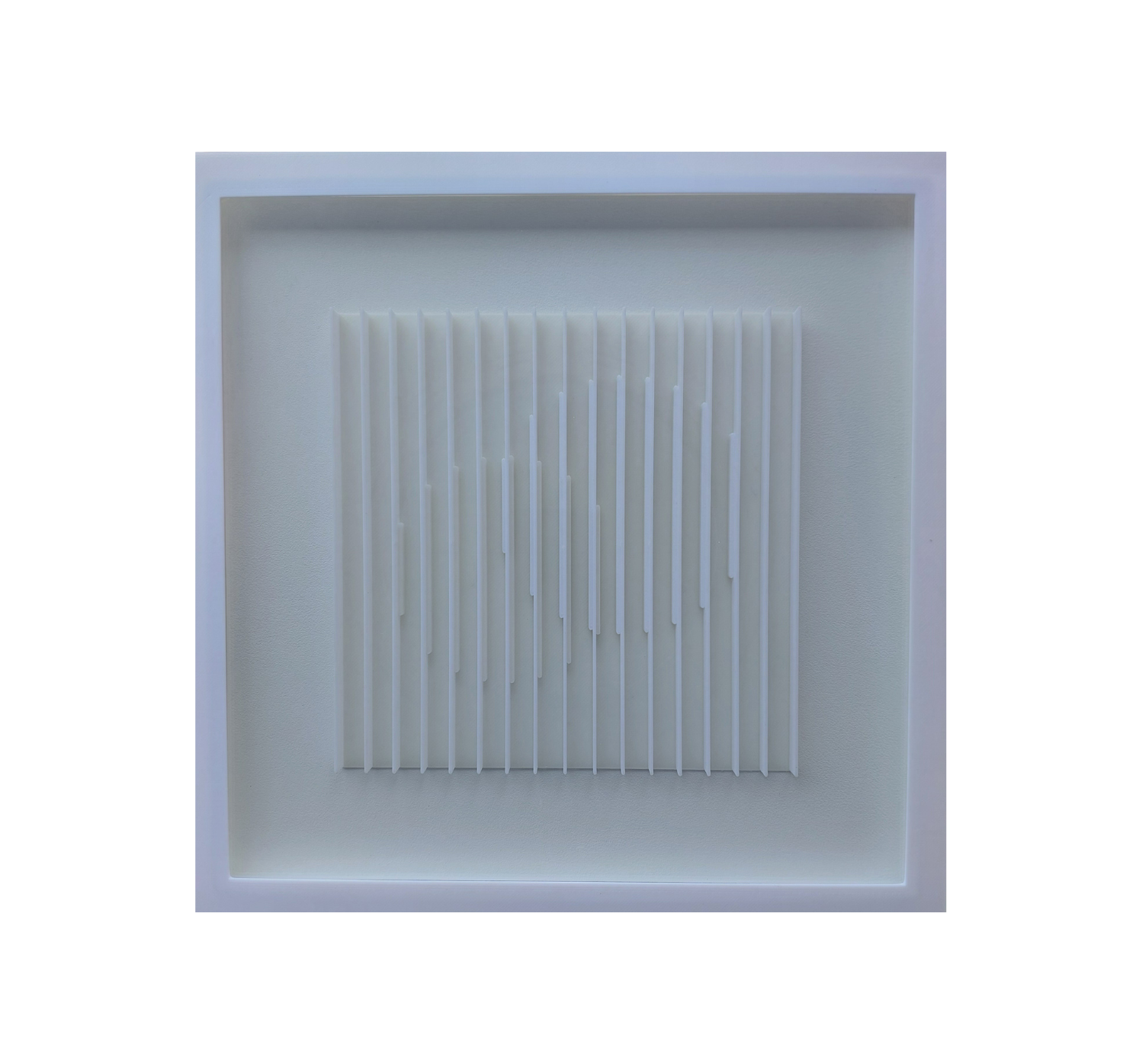 Erasmo crea obras con materiales y objetos fabricados por él mismo a través de la impresión en 3 dimensiones, con los cuales va armando distintas composiciones geométricas, con un potente efecto visual y óptico que cambian dependiendo del ángulo desde donde se observen.