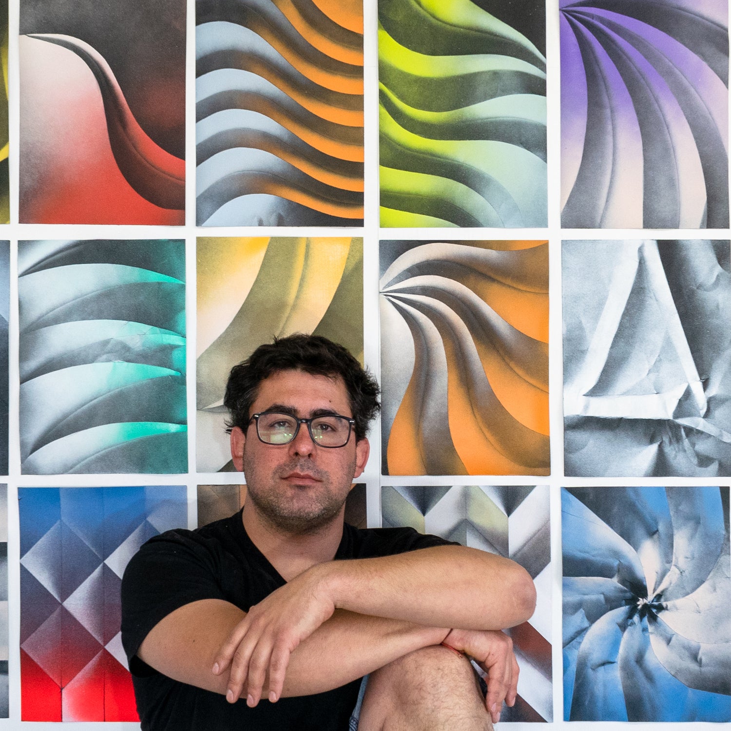 “Mi trabajo tiene solamente dos variables, el papel y el spray. El papel se arruga y dobla, en ese estado se pinta y finalmente se plancha. Con este proceso, la obra transmite toda la manipulación del papel, toda su historia plasmada en un instante, como una fotografía de una forma.